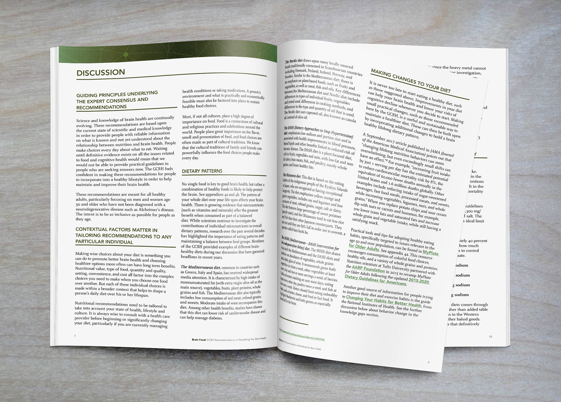 AARP report "Brain Food: GCBH Recommendations on Nourishing Your Brain Health." Design was based on a previous template then heavily altered. Displayed are a sample selection of the 36 page document.