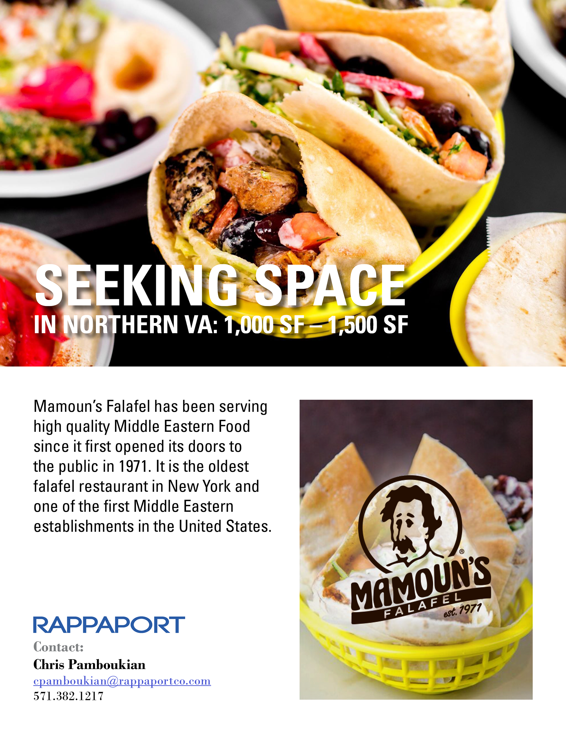 eBlast advertising that Mamoun's is seeking new real estate in Northern Virginia. Created while working for Rappaport.